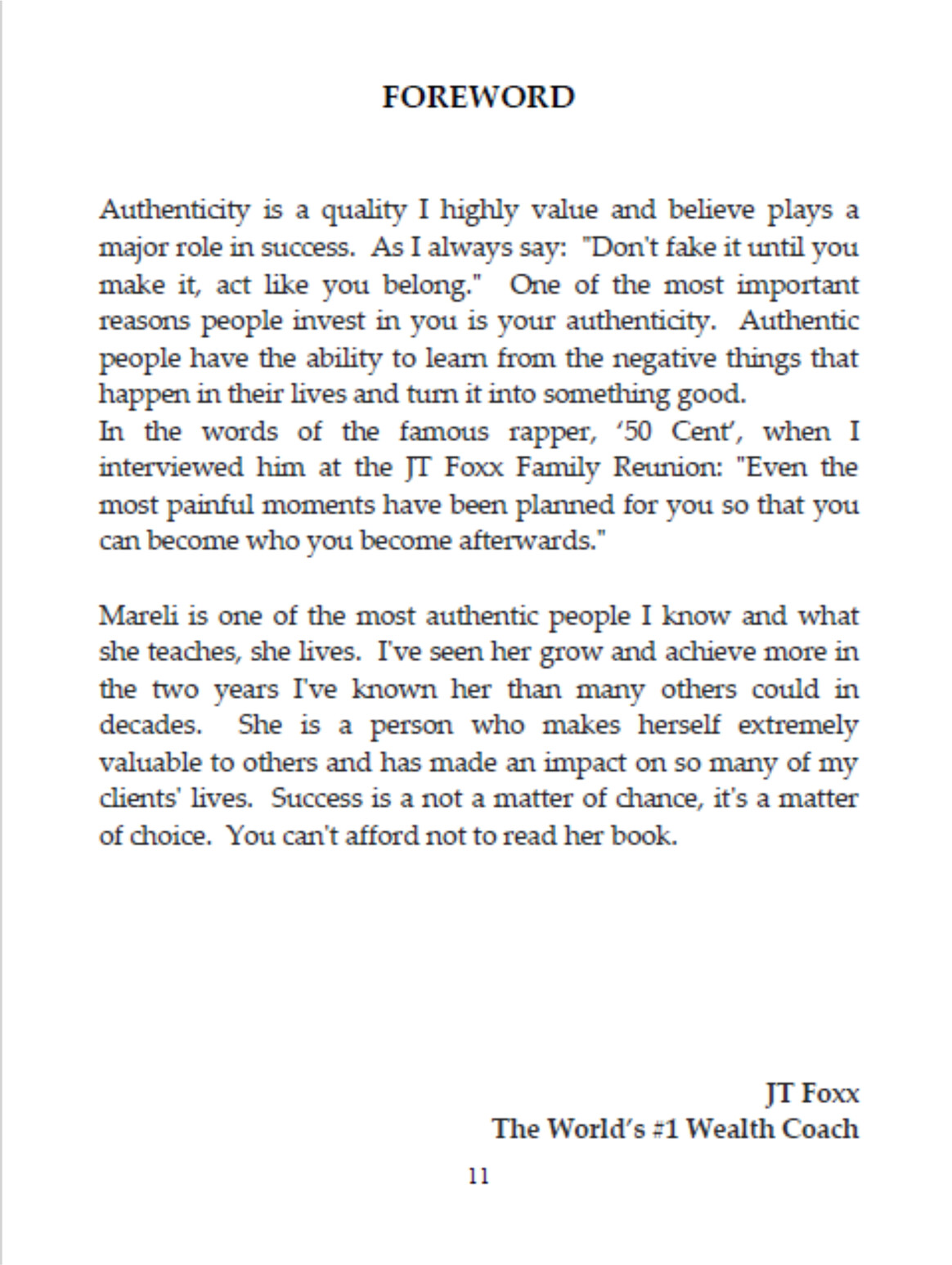 Following her award-winning Authenticity series on Radio W.O.R.K.S. World, in this transformational self-help book (including workbook), Mareli shares her authentic journey (from insecure high school loner to Award-Winning International Radio Host & Transformational Speaker, International Author), practical steps to uncover your authentic self, purpose and winning strategies to make your dreams a reality.